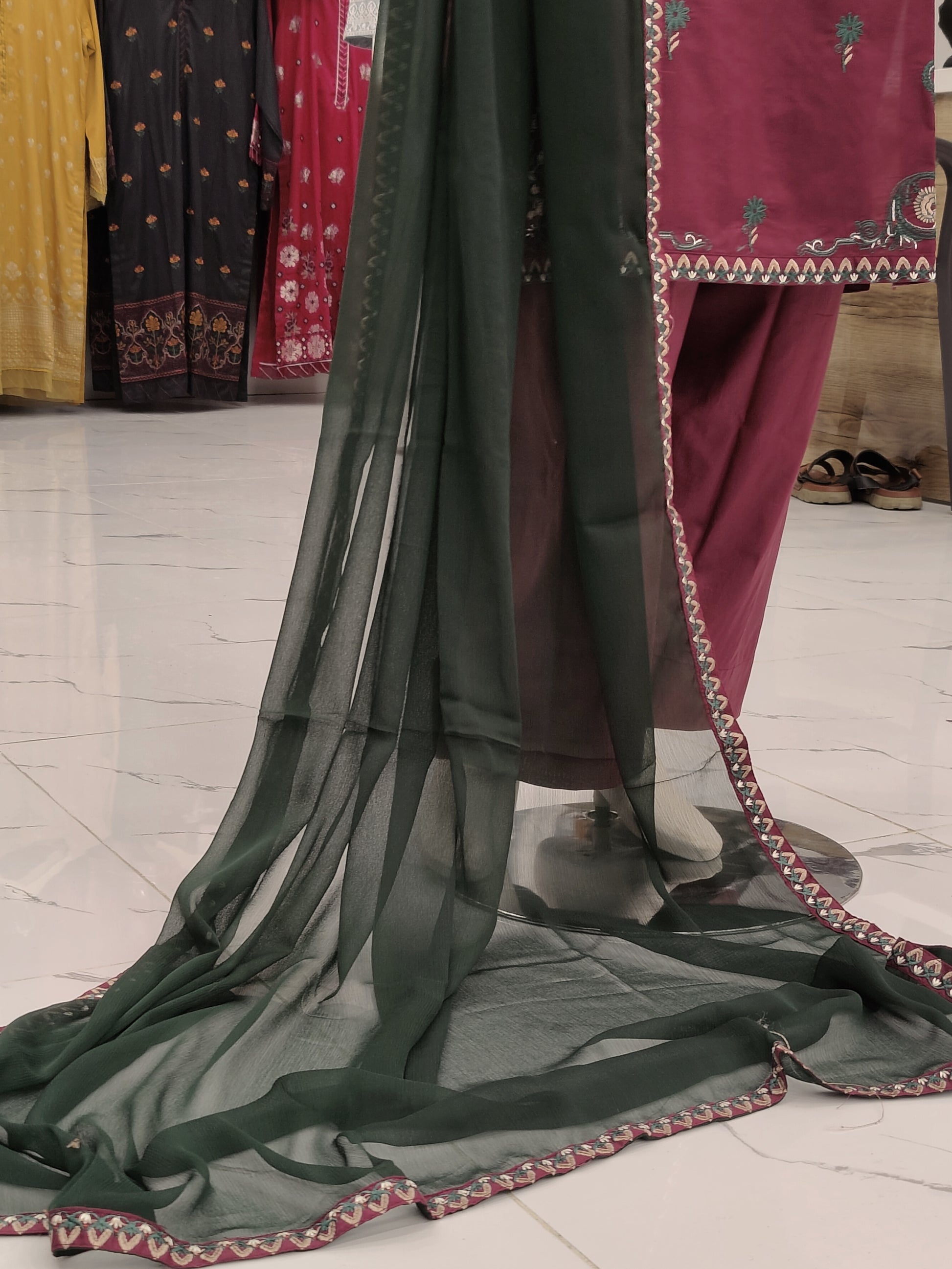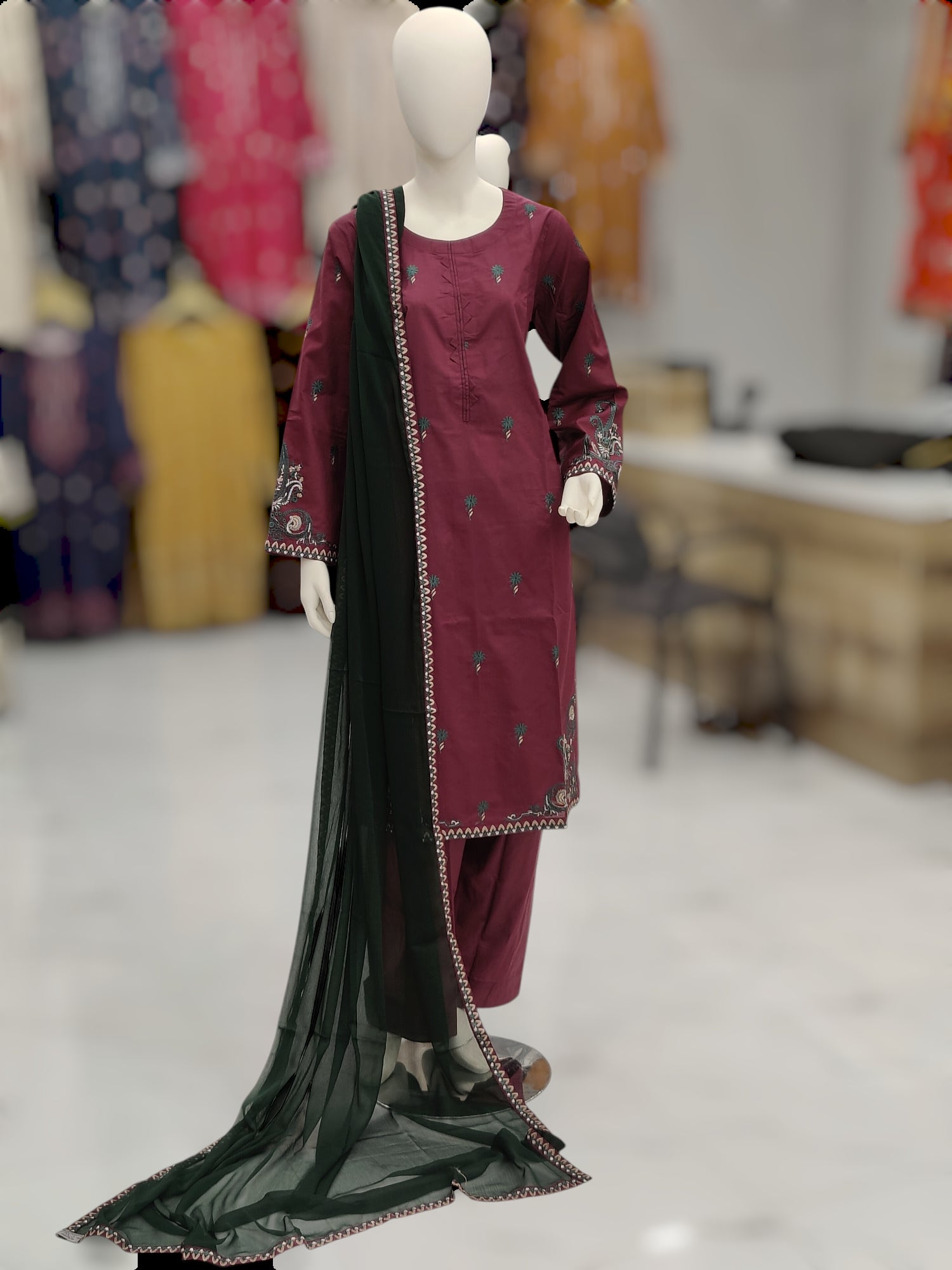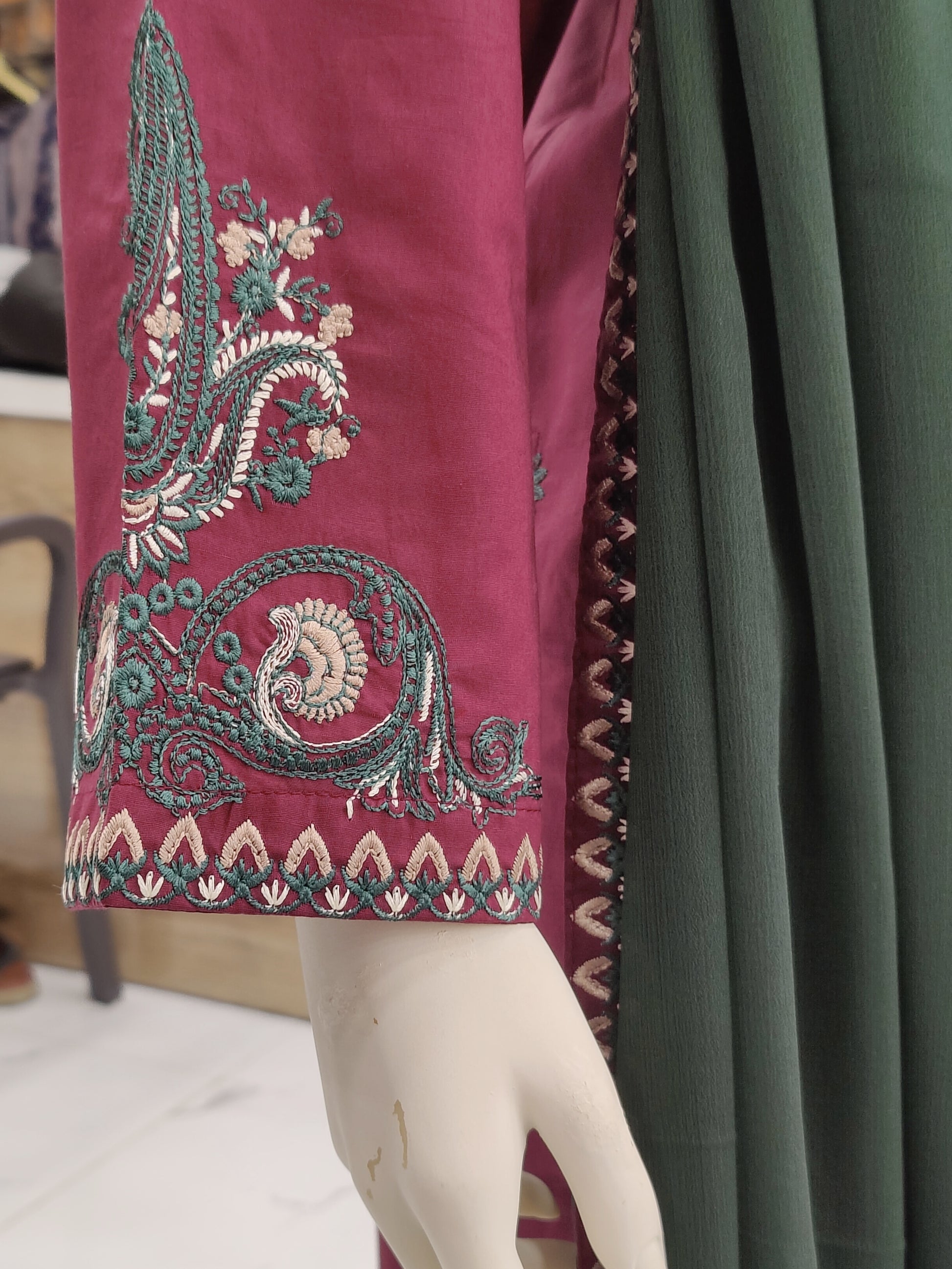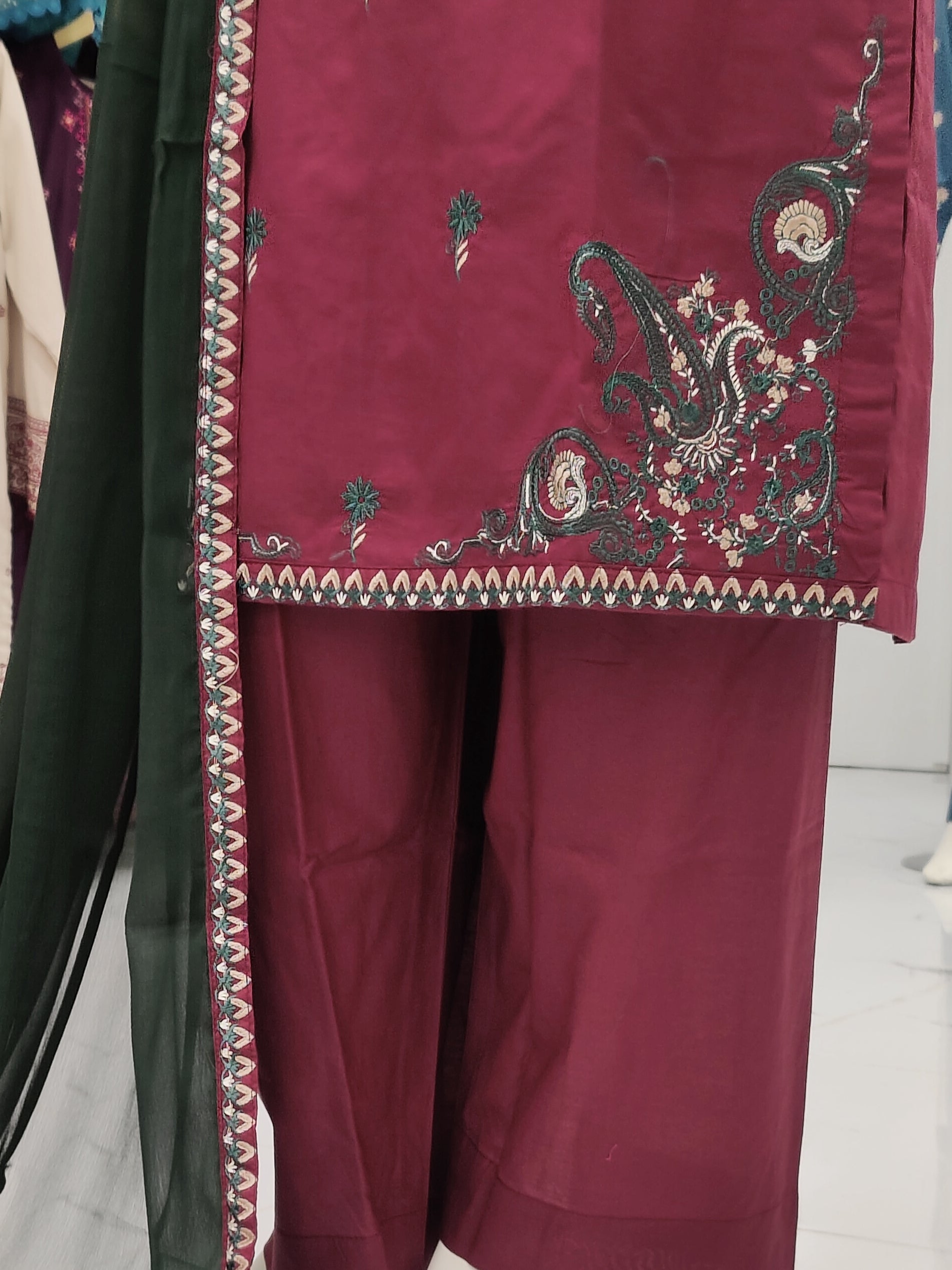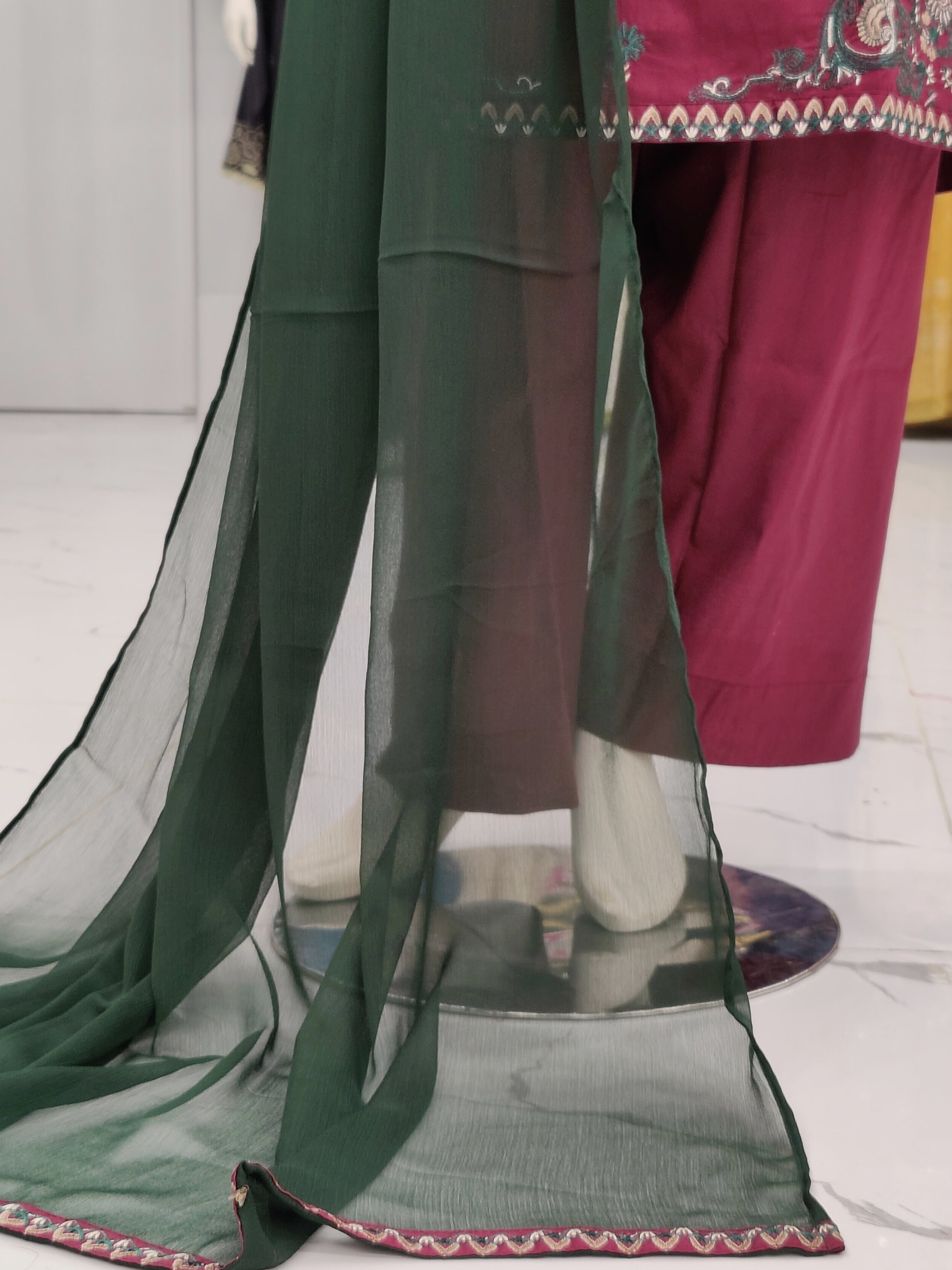 Dark Maroon Embroidered | dark Green Chiffon Dupatta | Stitched | 3 Piece