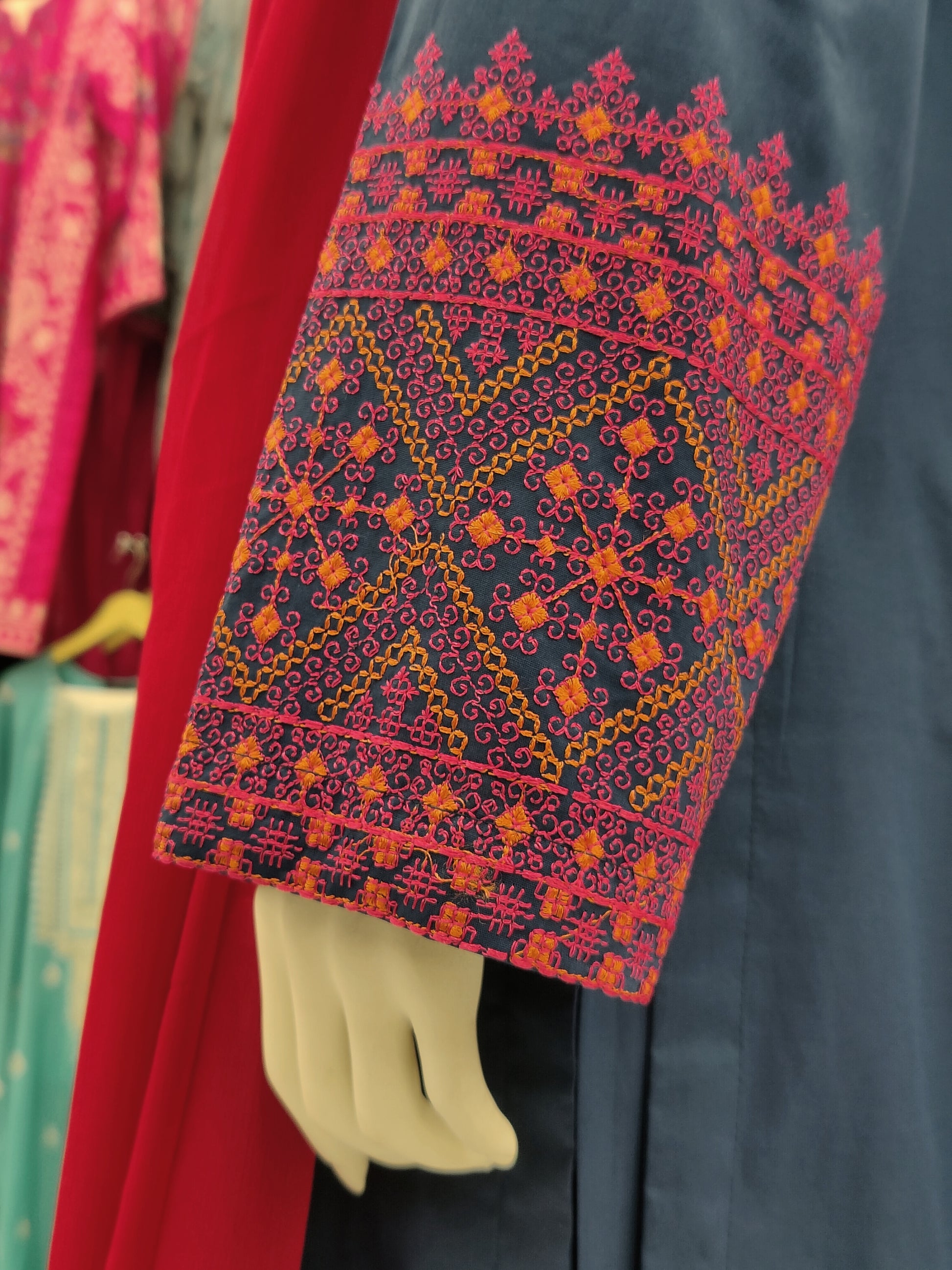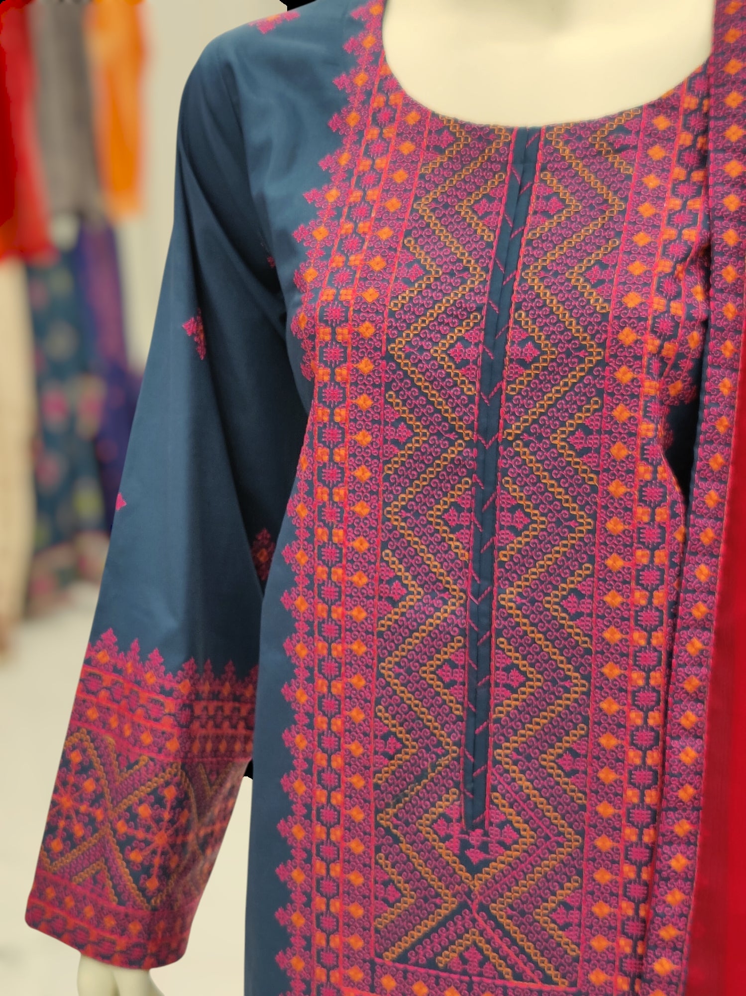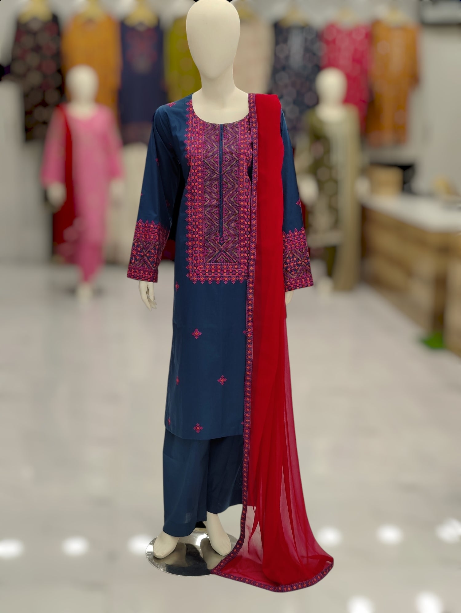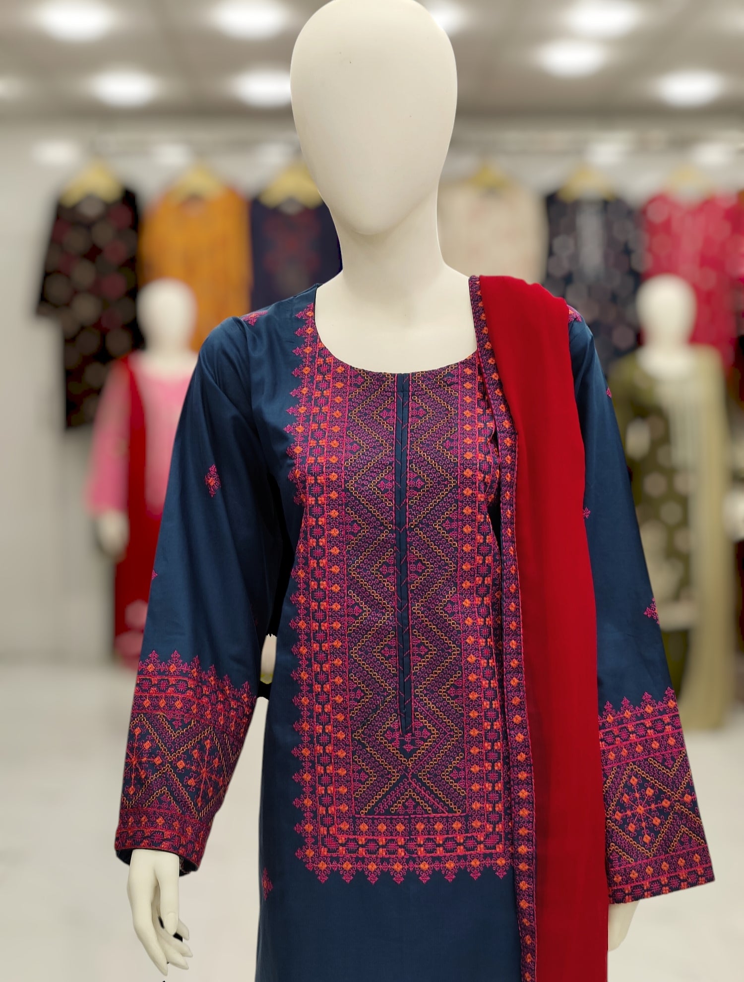 Embroidered Dark Blue Shirt 3 Piece | Chiffon Bordered Dupatta | Stitched