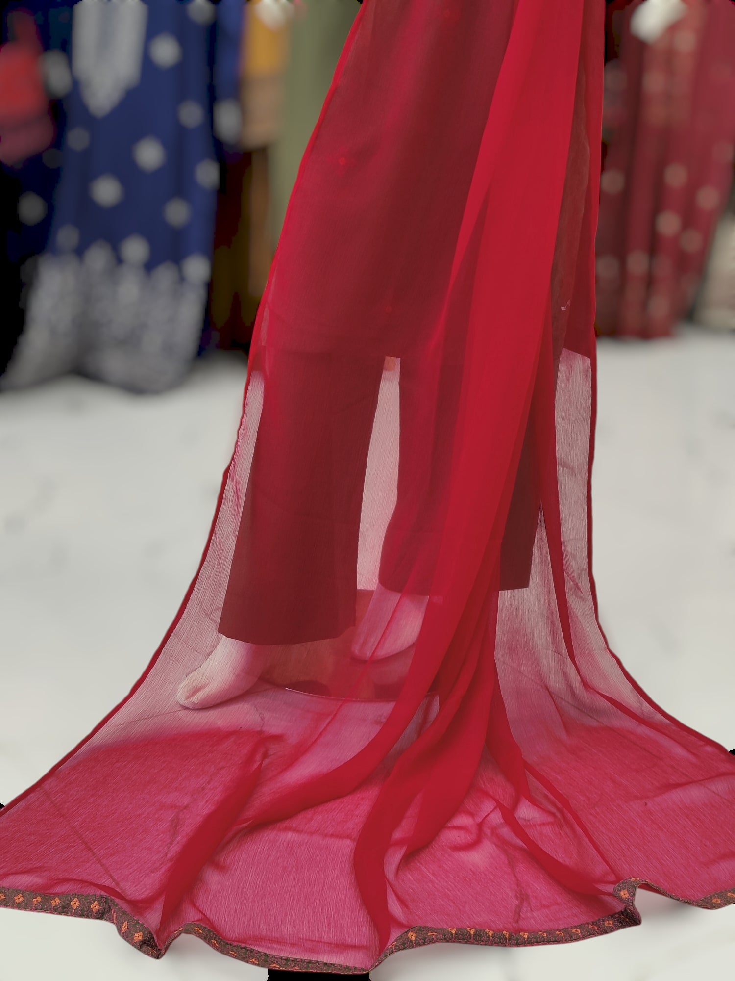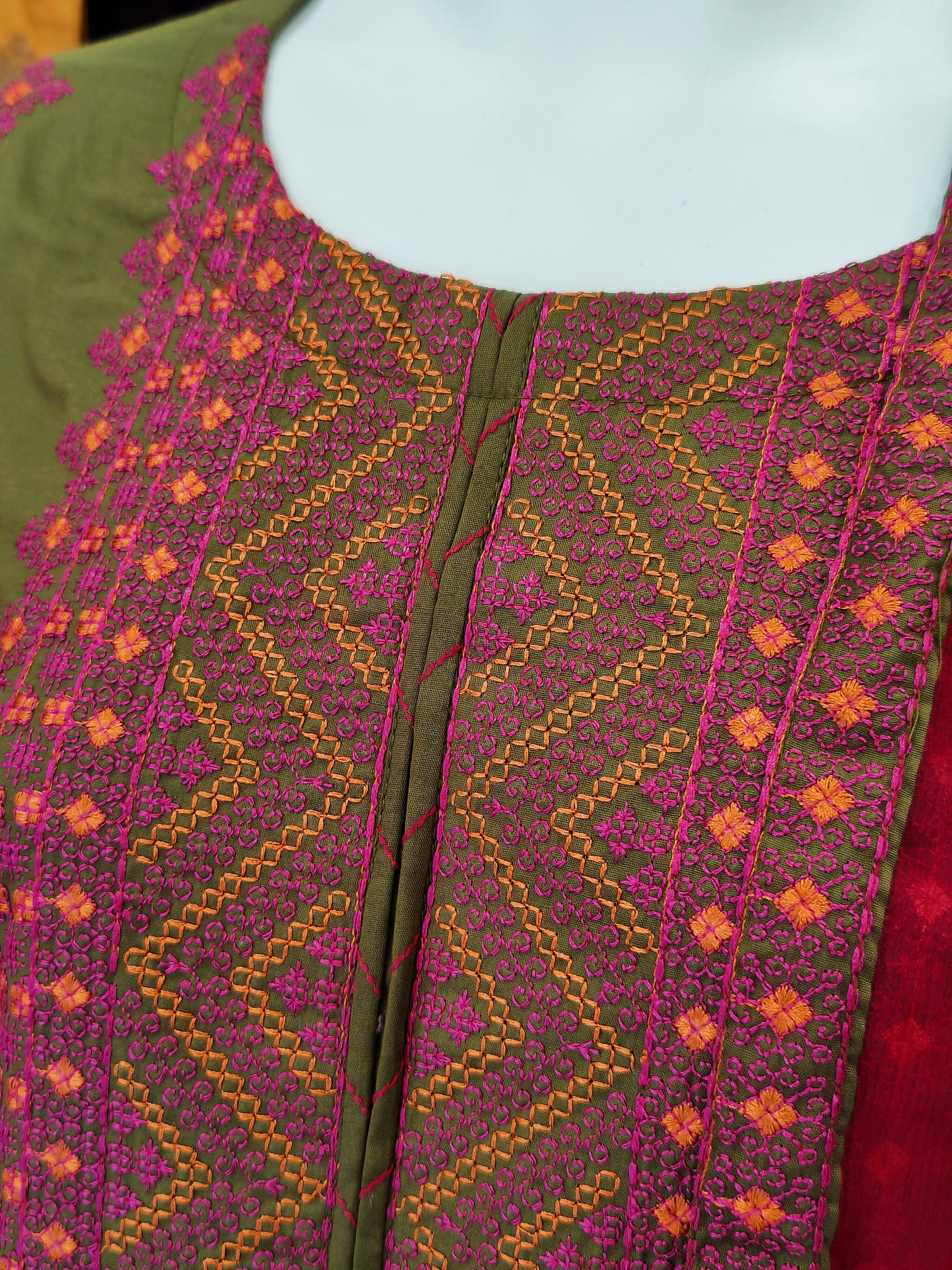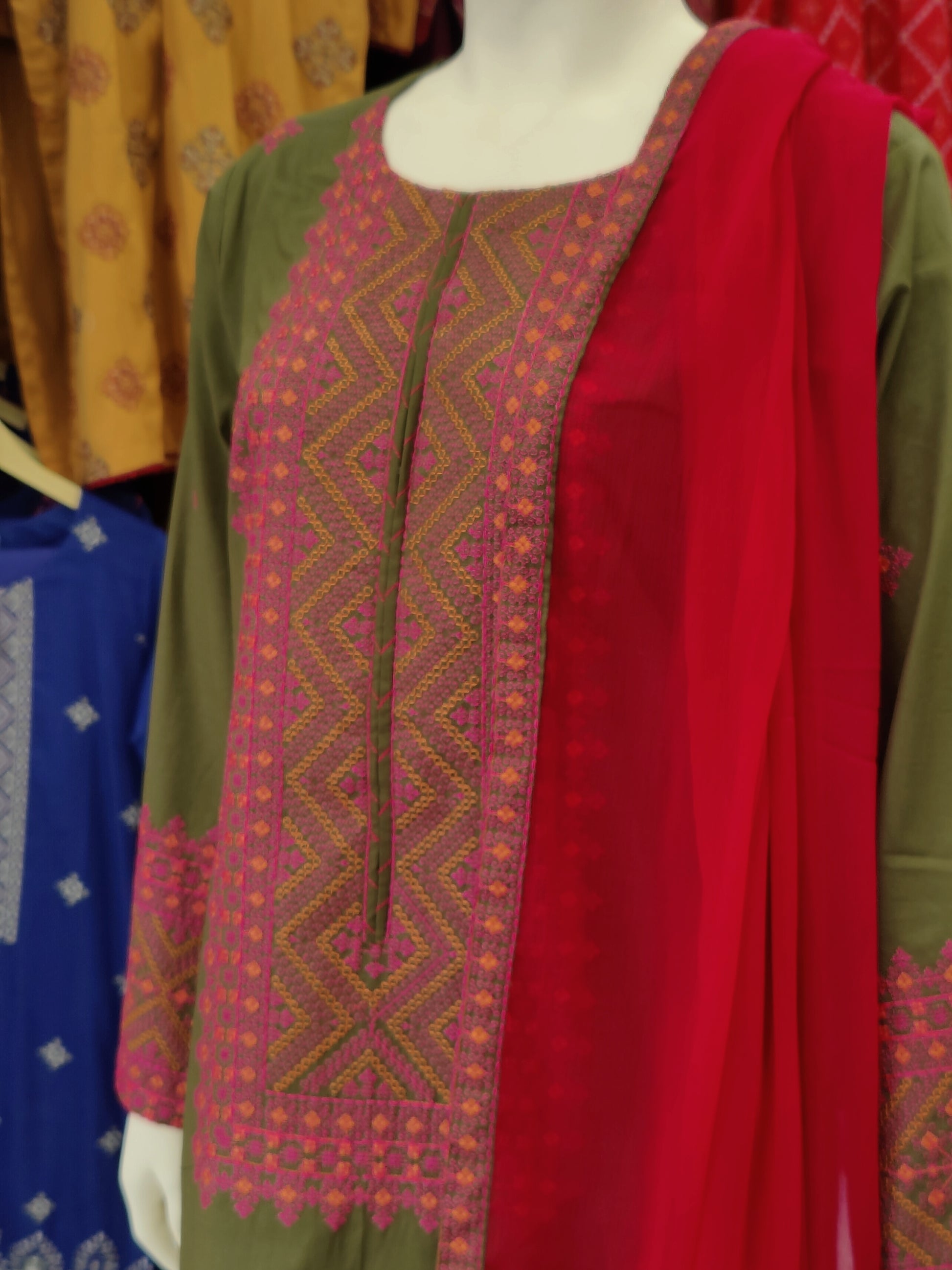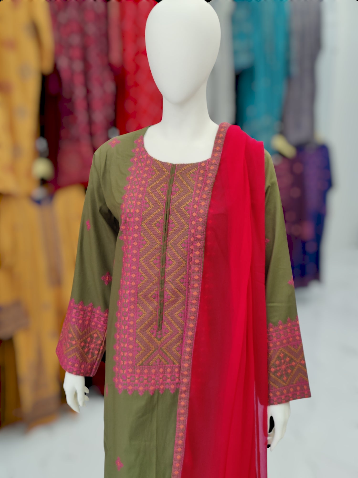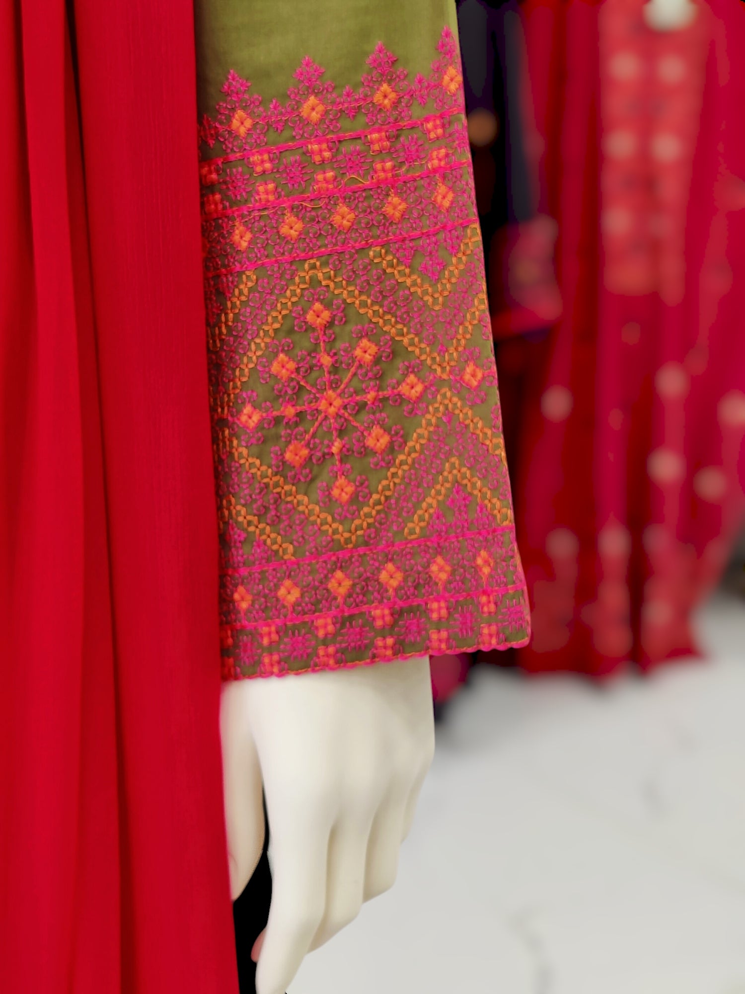 Embroidered Mehendi Shirt 3 Piece | Chiffon Bordered Dupatta | Stitched