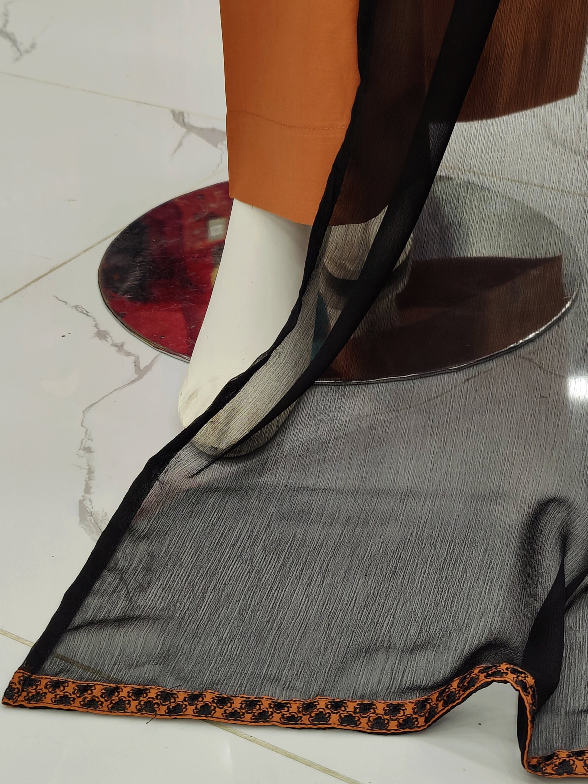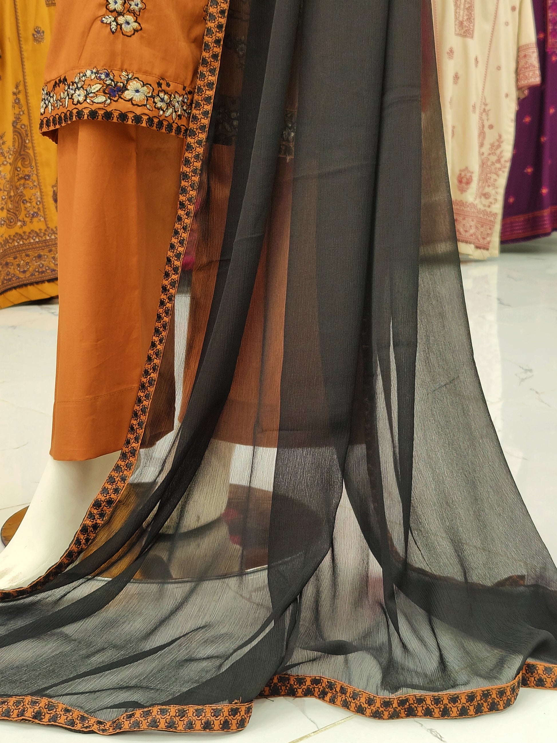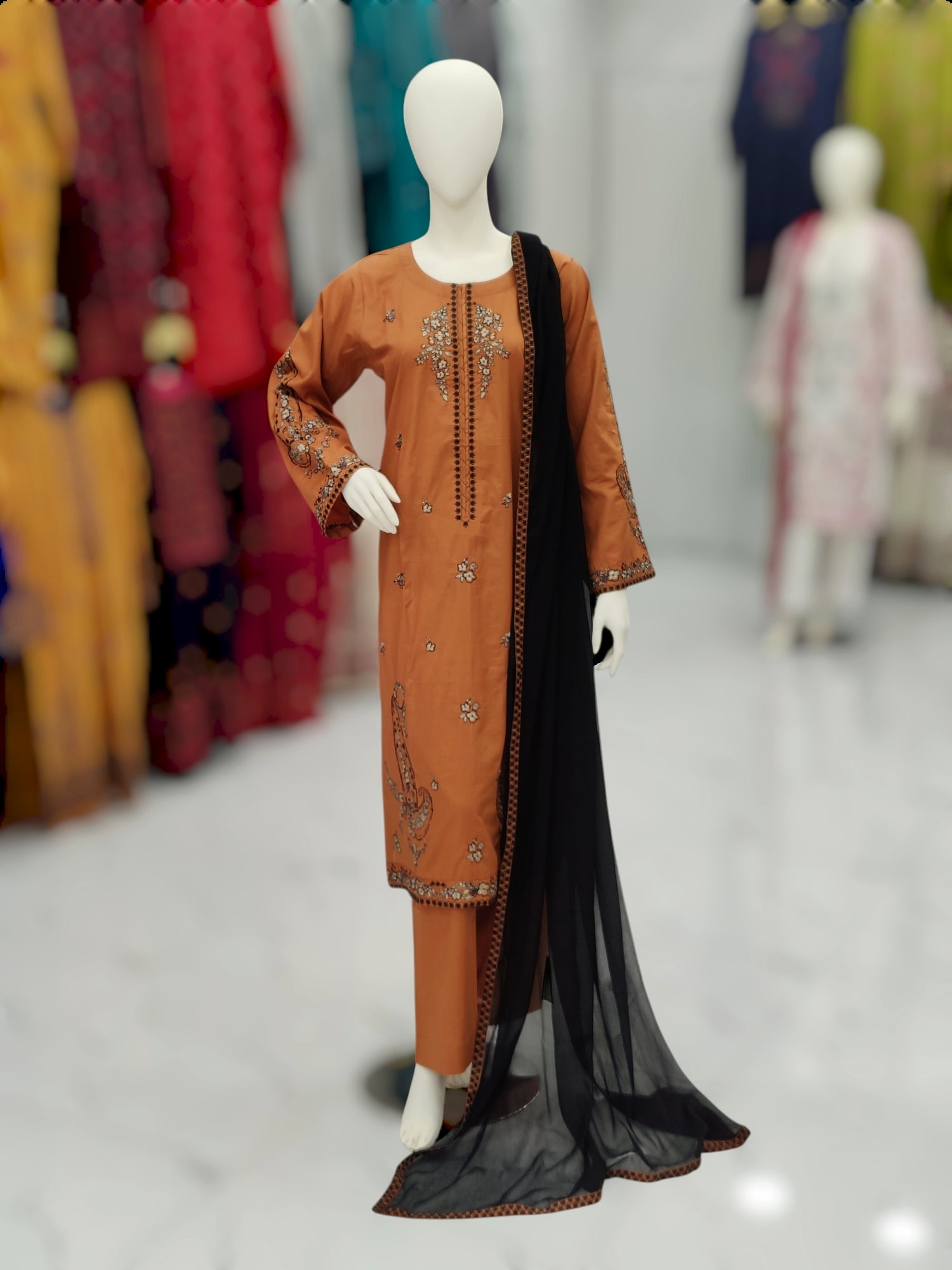 Embroidered Orange Shirt 3 Piece | Chiffon Bordered Dupatta | Stitched