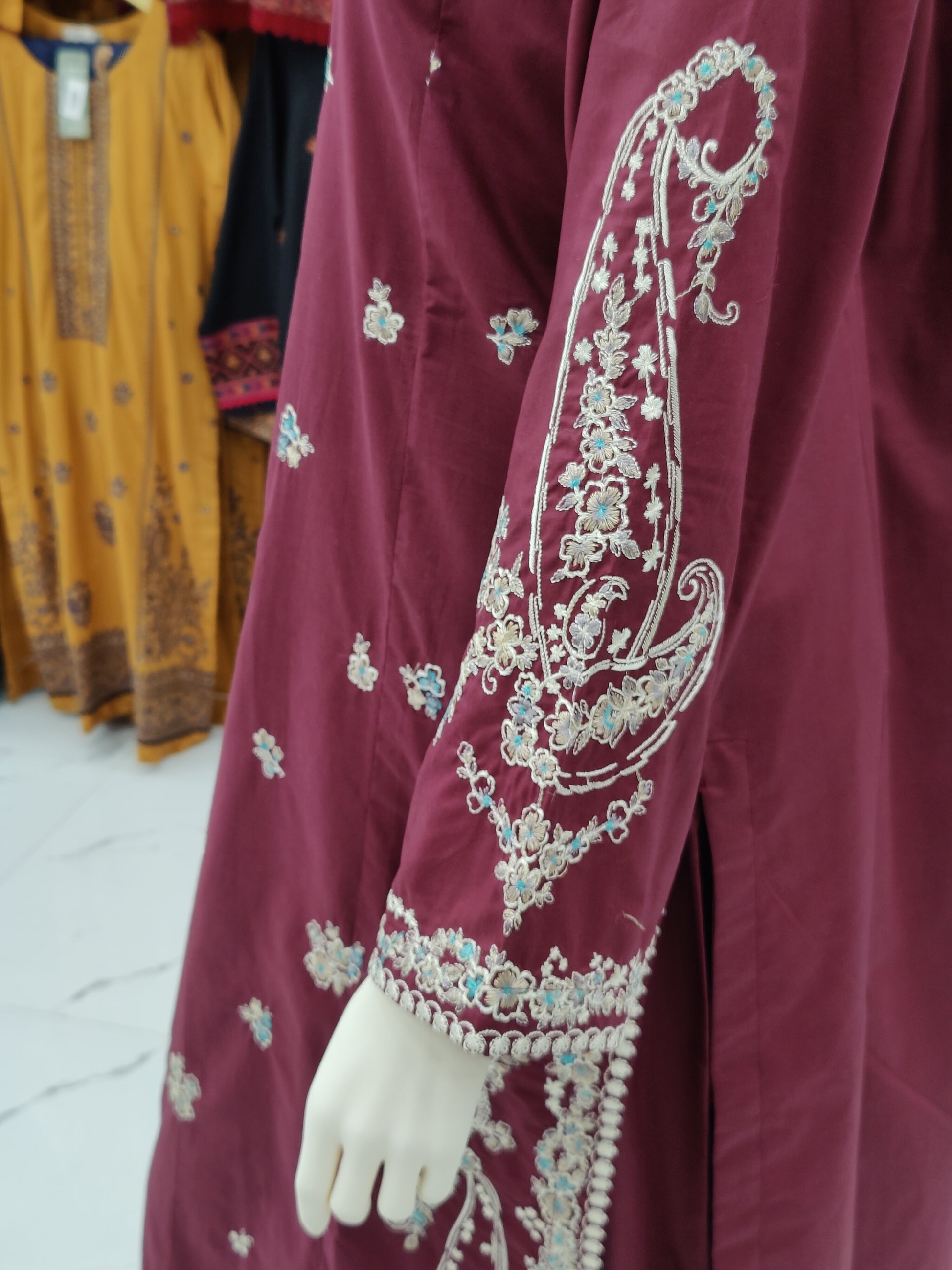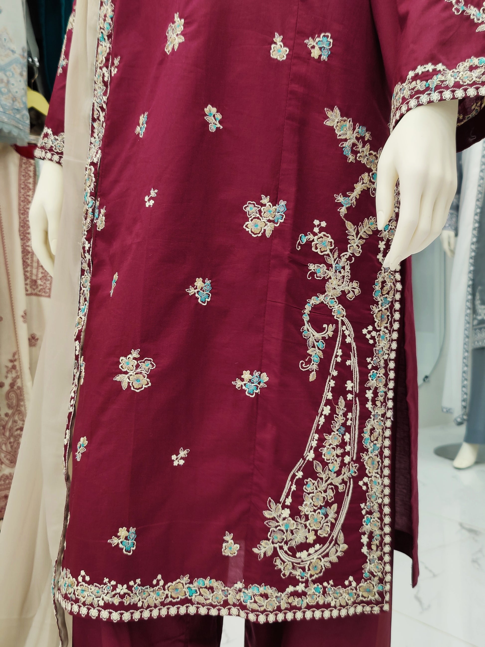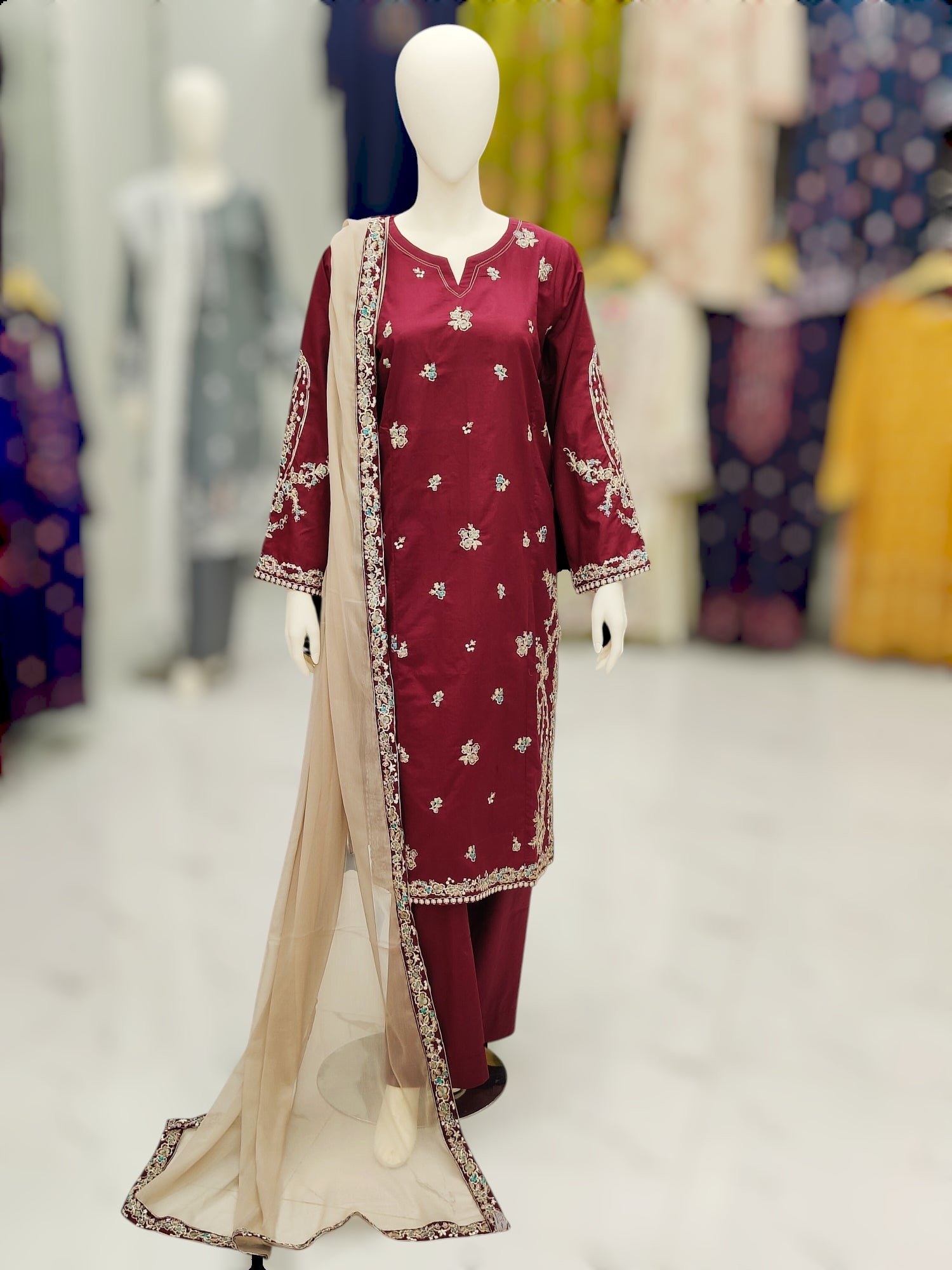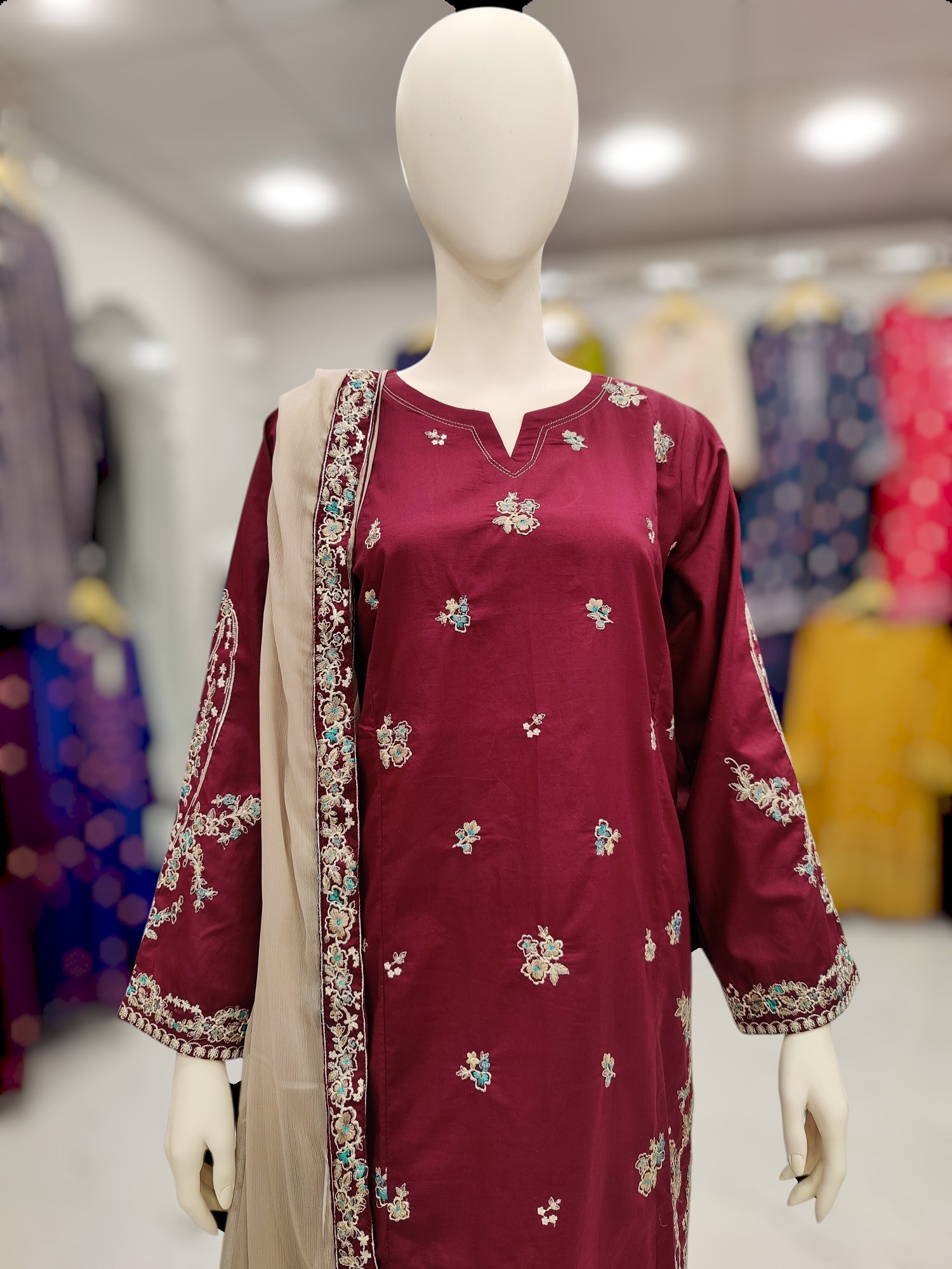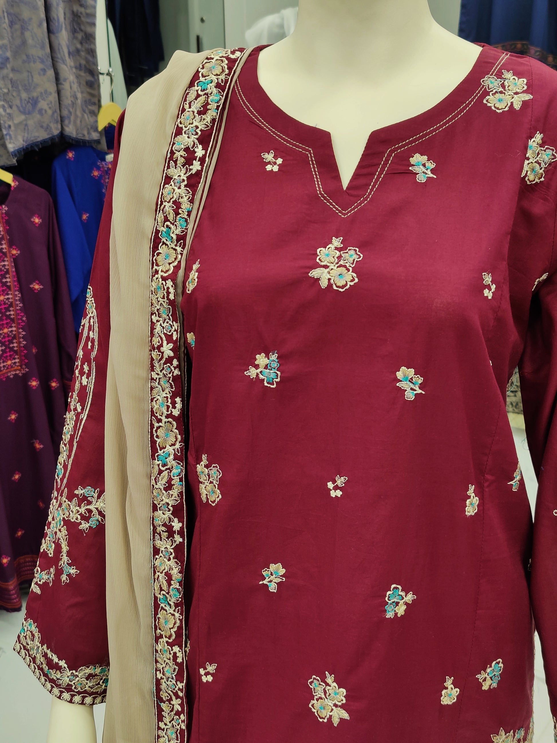 Maron Embroided Shirt | Light Brown Chiffon Dupatta |Stitched | 3 Piece