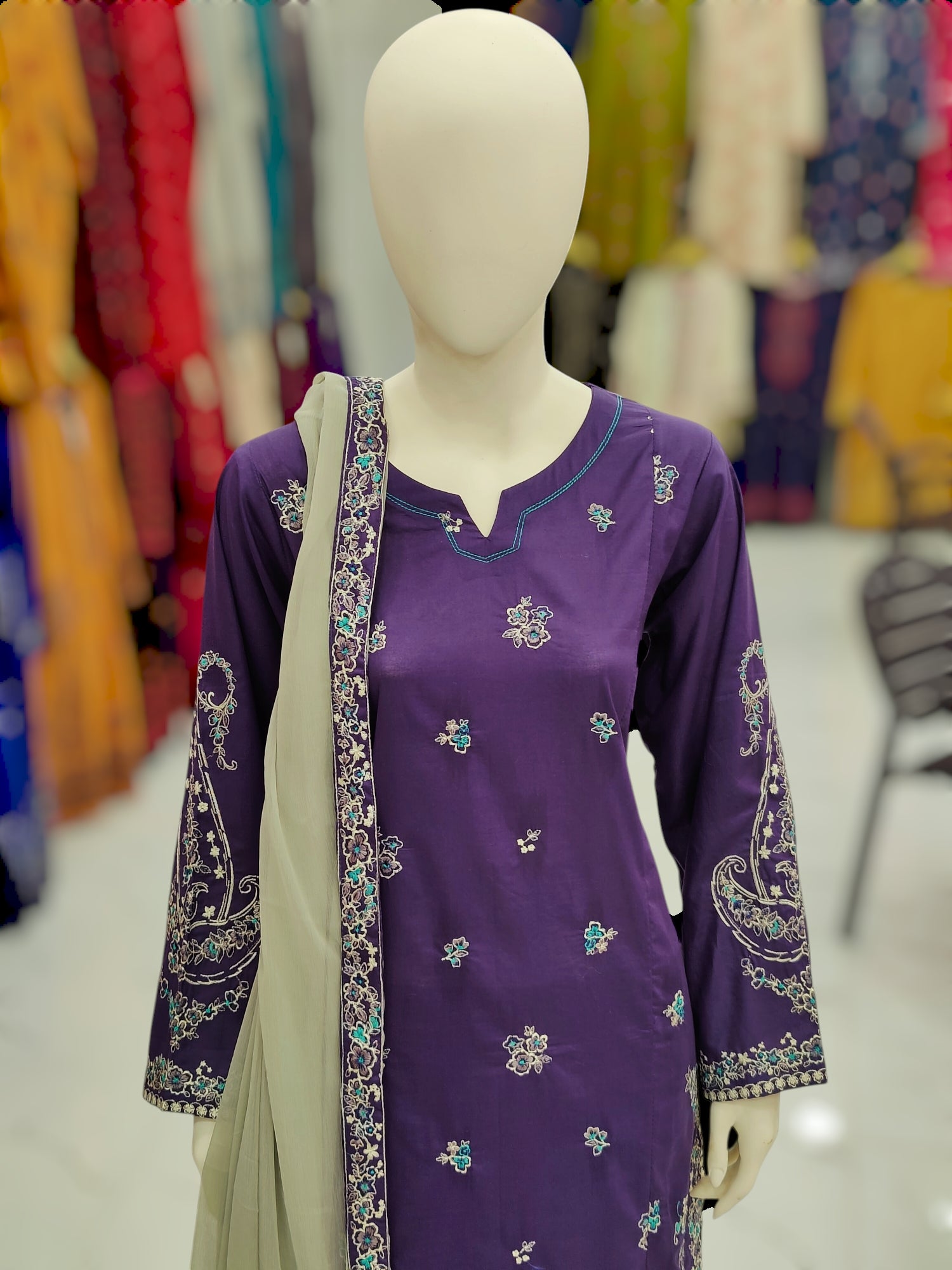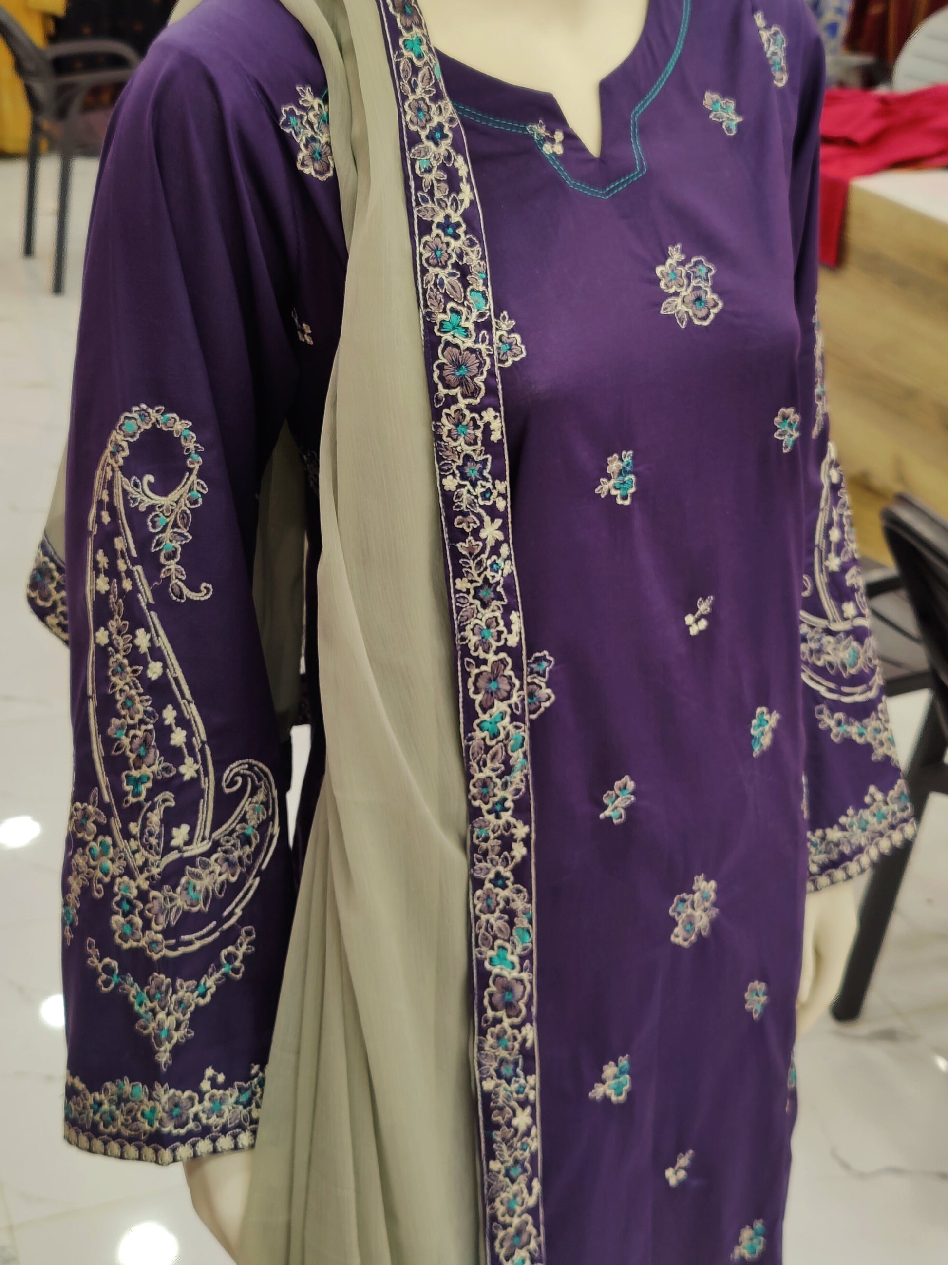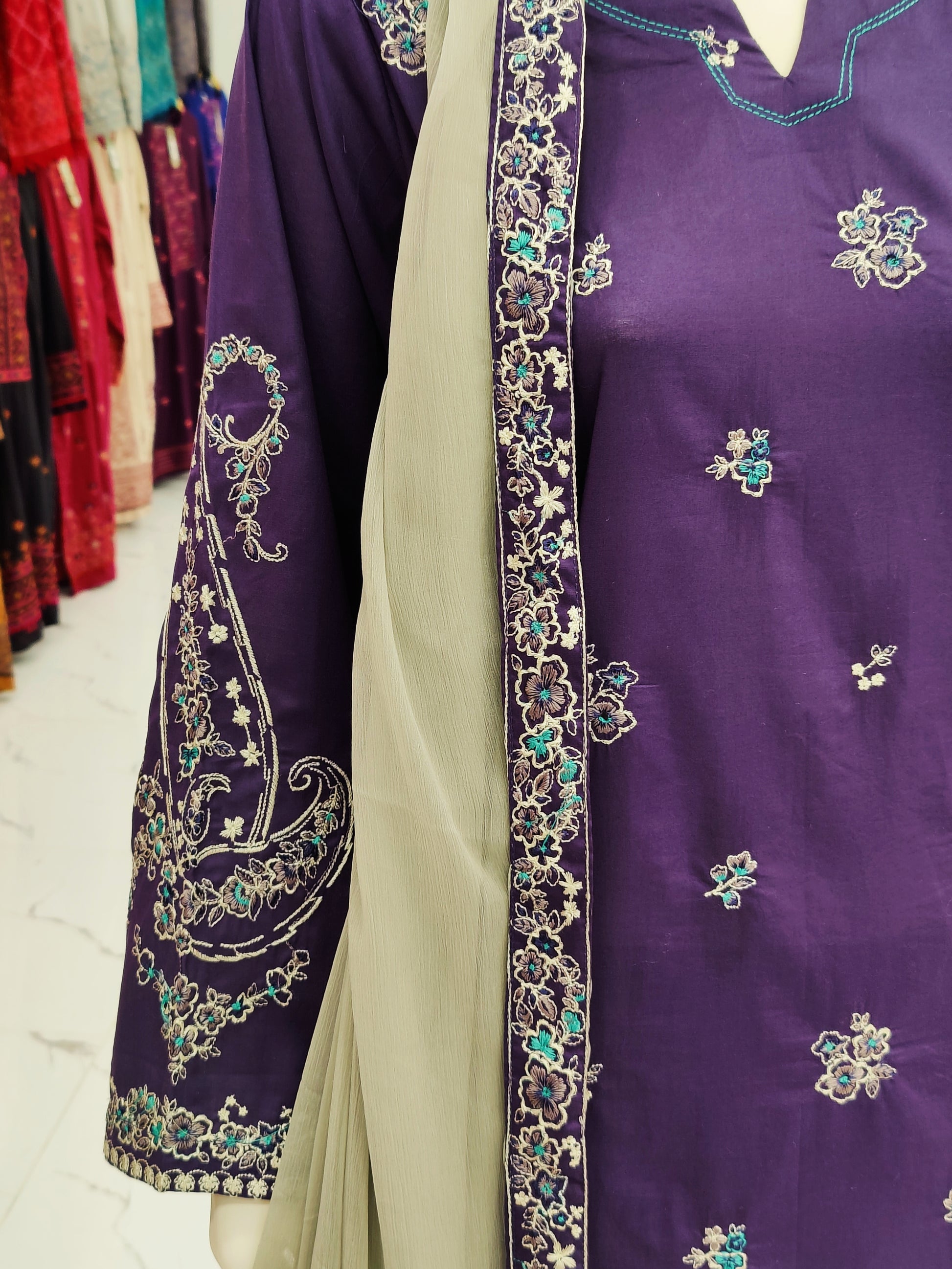 Purple Embroided Shirt | Light Gray Chiffon Dupatta |Stitched | 3 Piece