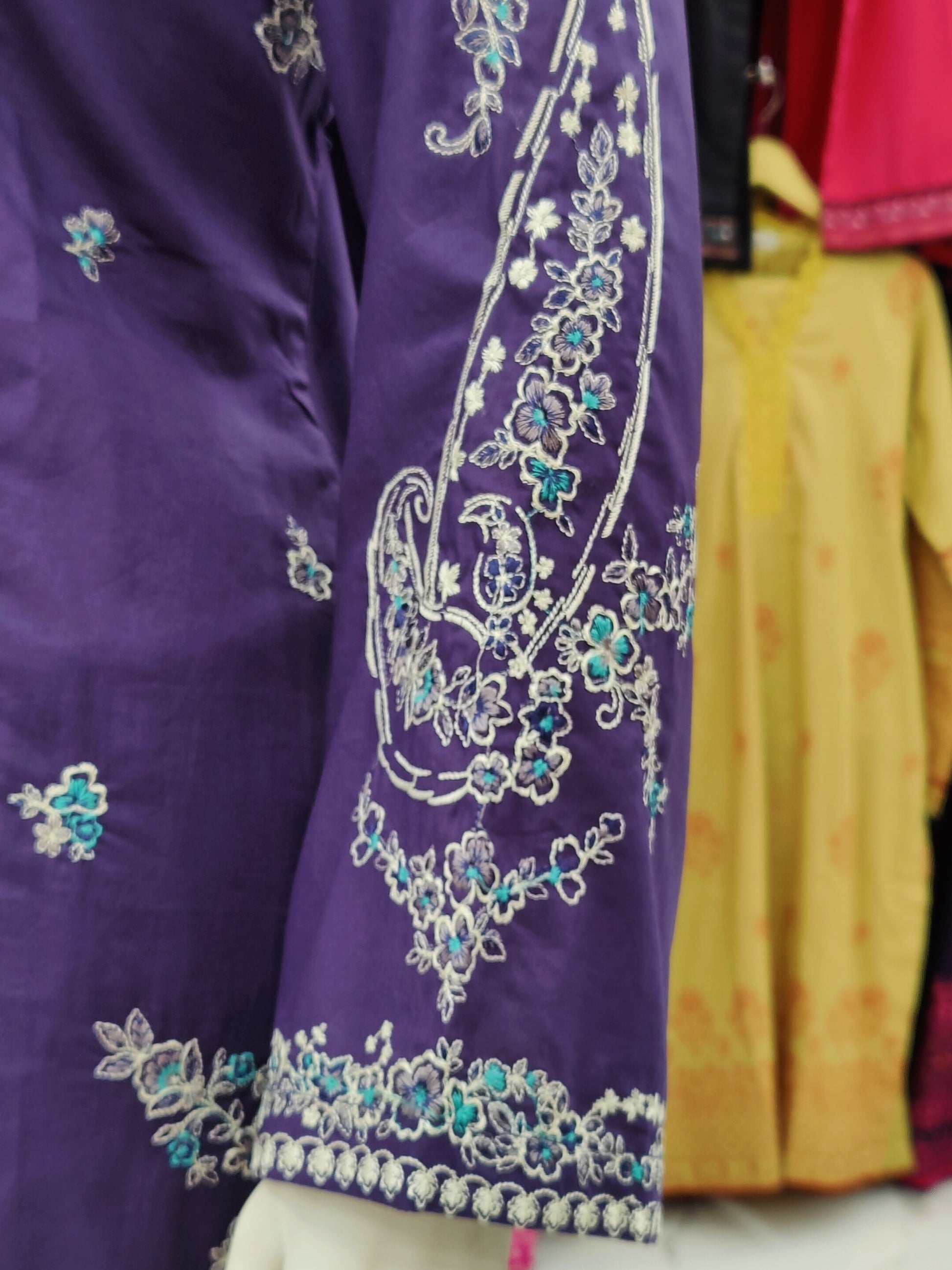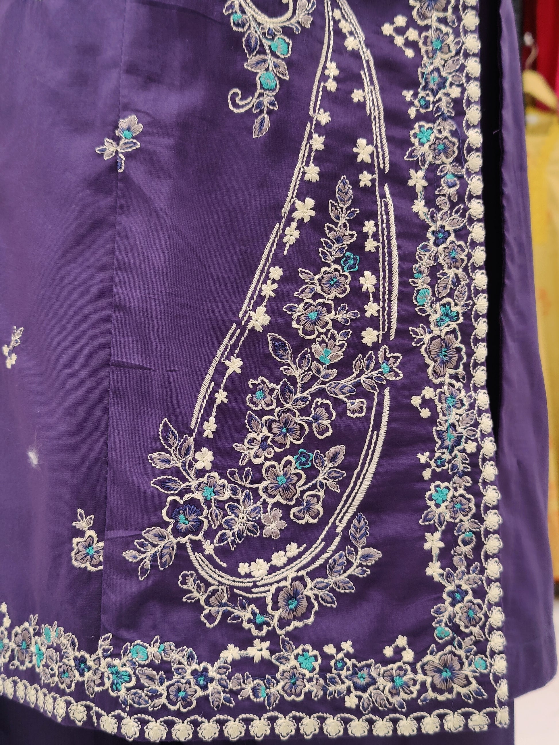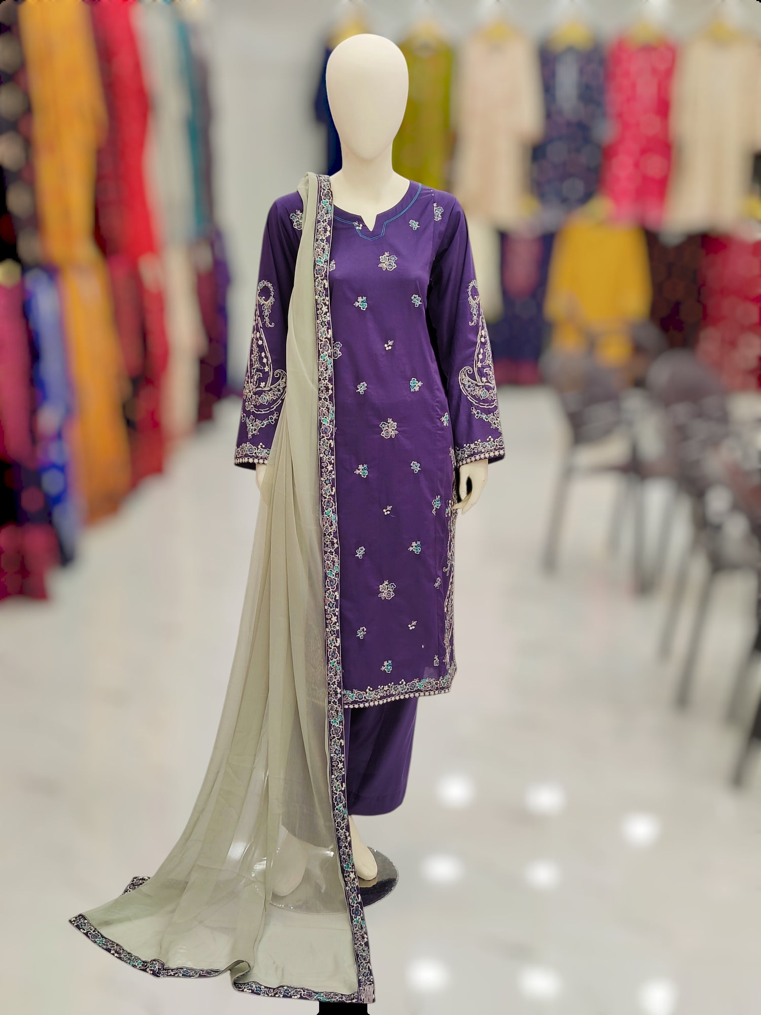 Purple Embroided Shirt | Light Gray Chiffon Dupatta |Stitched | 3 Piece